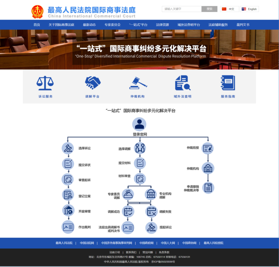 最高人民法院于2018年6月29日在深圳、西安分别设立第一、第二国际商事法庭,成立国际商事专家委员会,将符合条件的仲裁机构和调解机构纳入,建立诉讼与调解、仲裁有机衔接的“一站式”国际商事纠纷多元化解决机制。2021年7月21日,最高人民法院“一站式”国际商事纠纷多元化解决平台在国际商事法庭网站上线启动试运行。