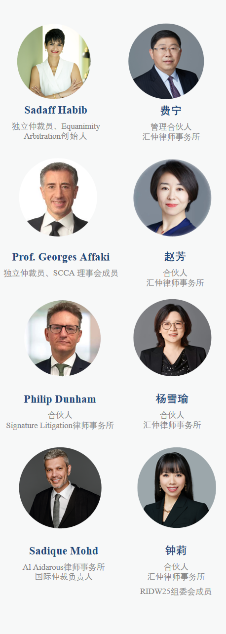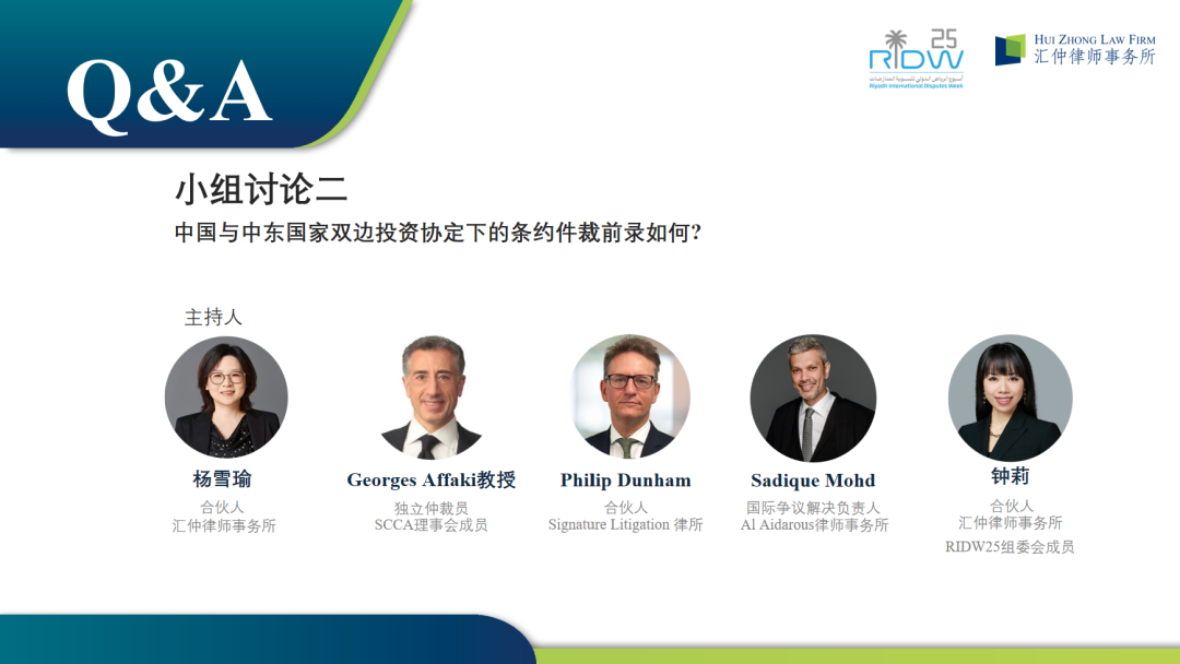汇仲律师事务所在RIDW25中成功组织举办了“中国相关争议解决须知”主题研讨会。本次会议的主要参会嘉宾有:Sadaff Habib女士,独立仲裁员、Equanimity Arbitration创始人;SCCA理事会成员兼独立仲裁员Georges Affaki教授;Signature Litigation律师事务所合伙人Philip Dunham律师;AL Aidarous律师事务所国际仲裁负责人Sadique Mohd律师。汇仲律师事务所管理合伙人费宁律师、合伙人杨雪瑜律师、合伙人赵芳律师、合伙人及RIDW25组委会成员钟莉律师出席了会议。