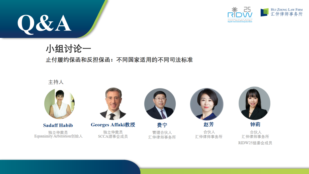 汇仲管理合伙人费宁律师致开幕词。会议由两轮小组讨论组成。第一轮小组讨论由Equanimity Arbitration创始人Sadaff Habib女士主持。费宁律师、赵芳律师、钟莉律师、Georges Affaki教授就“止付履约保函和反担保函:不同国家适用的不同司法标准”进行讨论。