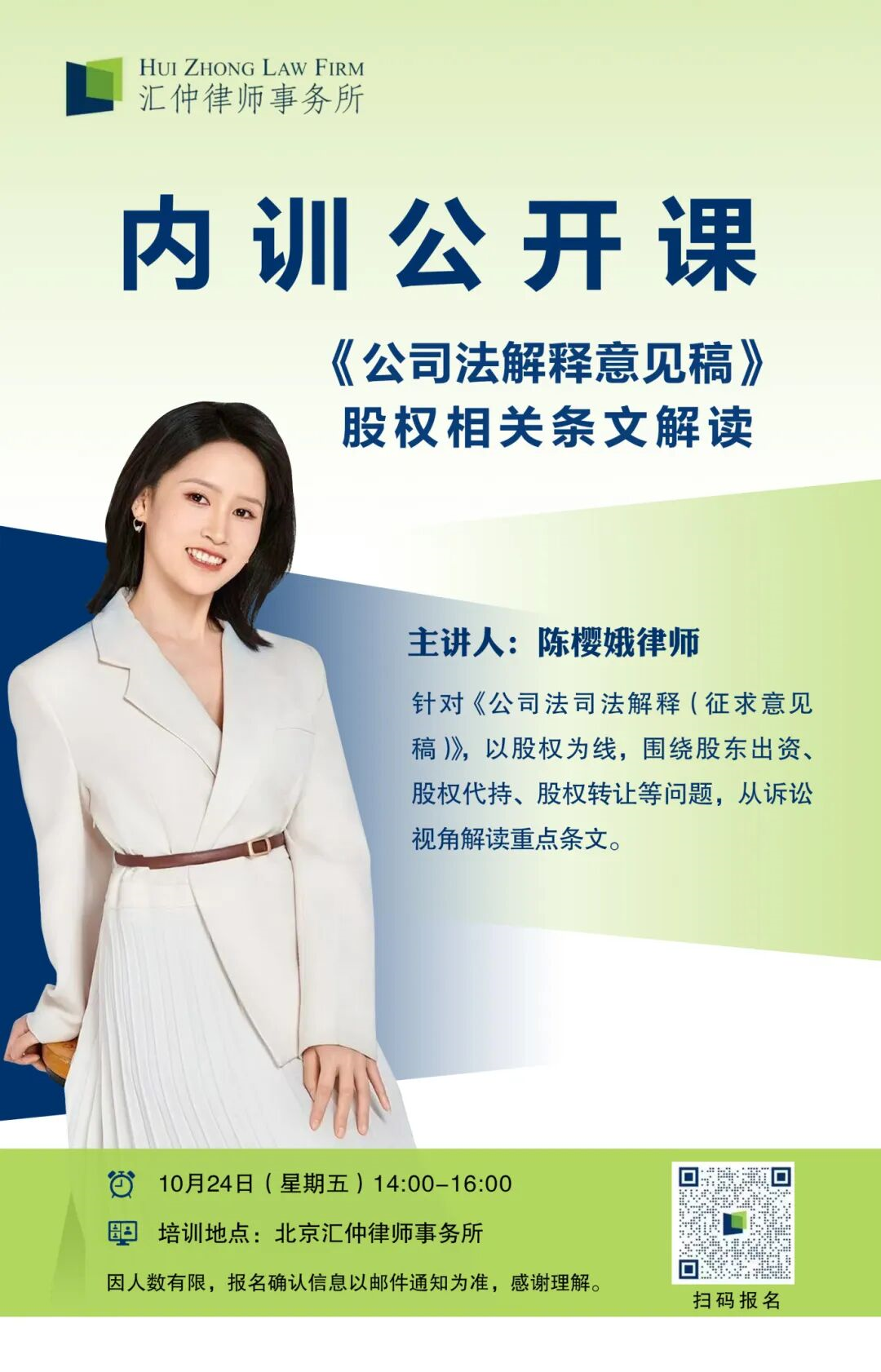 首次内训公开课将于2025年10月24日在汇仲律师事务所北京办公室举办,围绕公司法司法解释(征求意见稿)与股权相关的重点条文进行解读。欢迎有兴趣的同仁,扫码参会。因名额有限,报名确认信息请以邮件通知为准。