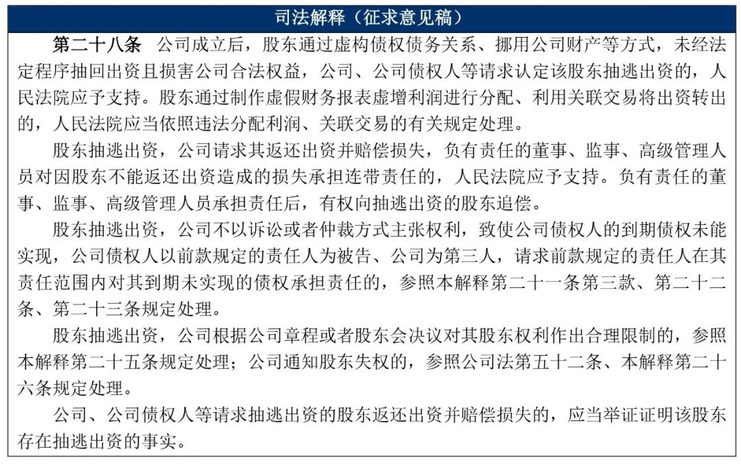 理由:《公司法解释(三)》规定的抽逃出资的具体情形包括“虚构债权债务关系将其出资转出”“制作虚假财务会计报表虚增利润进行分配”和“利用关联交易将出资转出。我们认为,将违法利润分配和关联交易交由利润分配和关联交易规则处理,确实能更准确地反映行为的性质,也有利于避免规则间不必要的交叉重叠。我们认为,征求意见稿第一款第一句已对抽逃出资作出正面界定,第二句没有必要专门强调两类情形不属于抽逃出资。第一,如果股东制作虚假财务报表虚增利润进行分配、进行关联交易达到了“将出资转出”的程度,逻辑上存在将其认定为抽逃出资的可能。第二,不属于抽逃出资的情形很多,除了虚增利润进行分配、利用关联交易将出资转出等情形外,还包括违法减资等,反面规定难以列举完全。故建议删去第一款第二句。