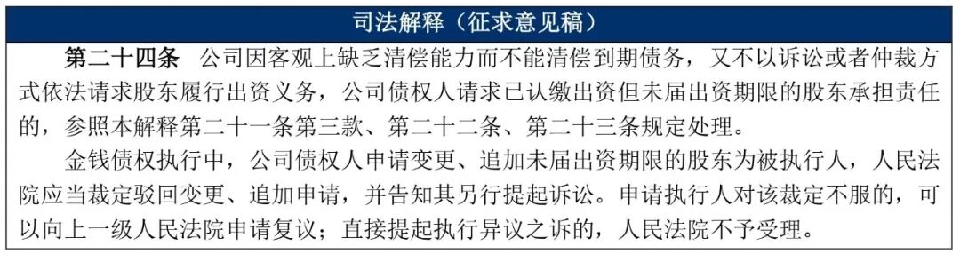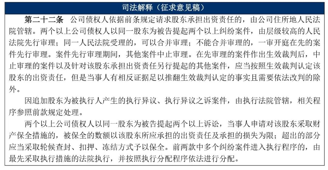 但我们认为,第一,其他股东仅起诉违约责任可能是出于节约诉讼成本等考虑,未必是为了优先获偿。第二,现行法下,董事负有明确的催缴义务及赔偿责任,并无必要强行要求其他股东必须同时起诉出资义务本身。第三,本条的用语虽然是法院“可以”追加第三人并要求其他股东变更/增加诉请,似乎为法院作不同处理留下了余地,但实践中法院可能很难判断其他股东仅起诉违约责任究竟是基于正当目的还是为了优先清偿,故法院作相反处理的可能性很小。基于上述考虑,我们认为以此种极端方式限制其他股东的诉权,法理依据并不充分,建议删去本条。