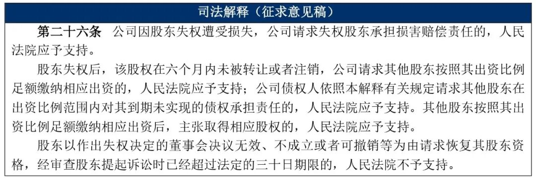 【建议】将第二款改为“股东失权后,该股权在六个月内未被转让或者注销,公司请求其他股东按照其出资比例足额缴纳相应出资的,人民法院应予支持,其他股东按照出资比例取得相应股权;公司债权人依照本解释有关规定请求其他股东在出资比例范围内对其到期未实现的债权承担责任的,人民法院应予支持”。