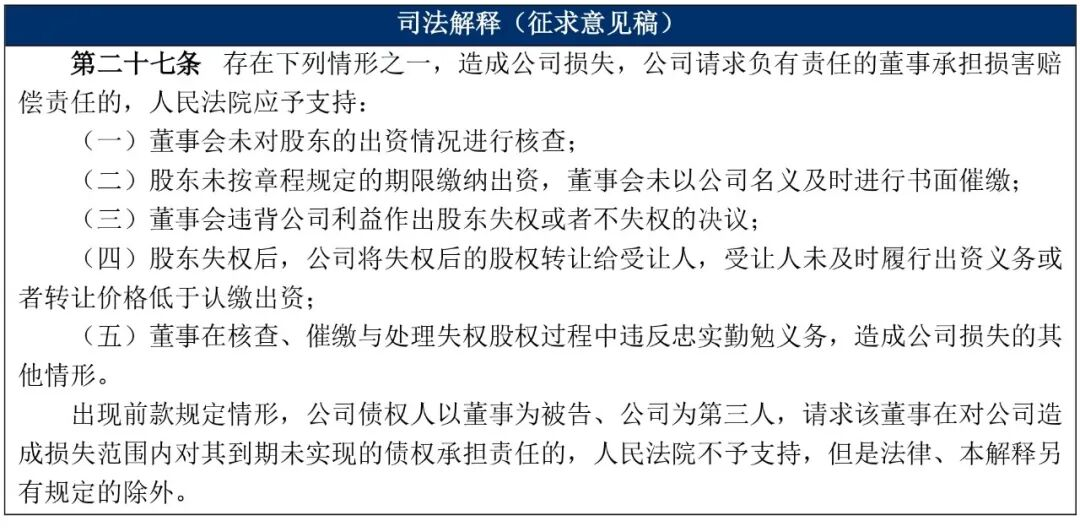 理由:我们理解,本条第二款的设计初衷在于避免债权人过多干预公司治理,但这一规定设定有违《公司法》的体系解释,也与司法实践中备受关注的“斯曼特”案件裁判要旨相悖。第一,《公司法》第五十一条(催缴失权)、第五十三条(抽逃出资)、第一百六十三条(财务资助)、第二百一十一条(违法分配利润)、第二百二十六条(违法减资)等均要求“负有责任的董事”等承担赔偿责任。本征求意见稿也给予抽逃出资、违法减资等情形下,债权人可以请求相关董事承担责任,但唯独在催缴失权情形下不支持债权人请求董事承担责任,缺乏依据。第二,今年备受关注的胡秋生等6名董事与斯曼特微显示科技(深圳)有限公司损害公司利益责任纠纷经最高人民检察院抗诉后,最后获得再审改判,再审支持债权人对没有履行催缴义务的相关董事主张赔偿责任。本条第二款的规定背离了“斯曼特”一案的裁判要旨。