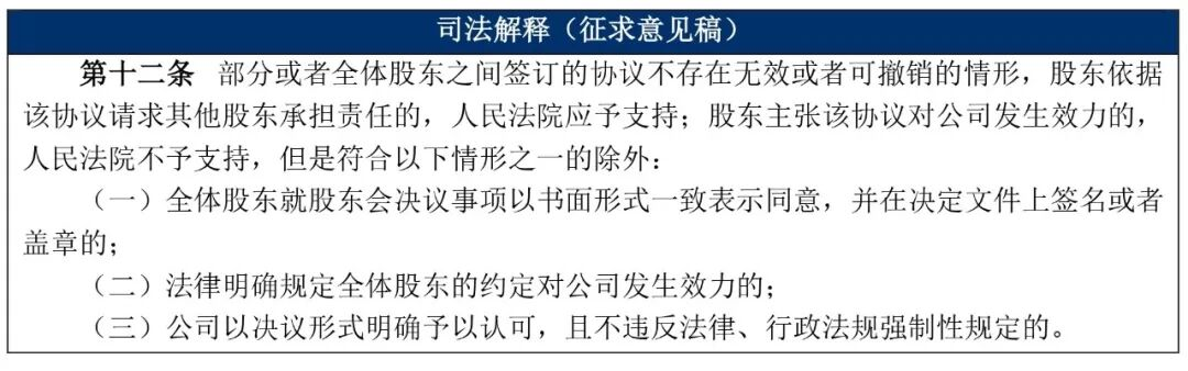 【建议2】本条规定的例外情形改为“(一)经有限责任公司全体股东在协议上以签名或盖章的形式一致表示同意,并通知公司的;(二)协议中与公司资本、公司治理有关的约定,经股东会以法律规定或公司章程约定的比例表决同意遵照协议执行的;(三)协议中非与公司资本、公司治理有关的约定,根据法律规定或公司章程约定,由董事会或者股东会决议,并由公司在协议上加盖公章的。”