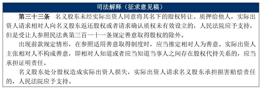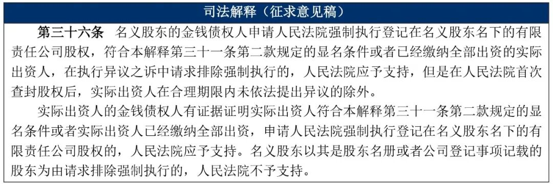 理由:实际出资人能够排除强制执行的原因是,实际出资人享有股权,而名义股东的债权人享有的仅是债权,基于“物权优先债权”权利效力位阶作出判断。在此逻辑下,关键是判断实际出资人是否取得股权,而按照征求意见稿第三十一条的规定,实际出资人只有在经过股东会决议、其他股东过半数同意或实际行使权利的情形下方可享有股权,本征求意见稿中在显名之外增加了“缴纳全部出资”这种情形,但此时实际出资人享有的亦仅是债权,无法对抗申请执行人。
