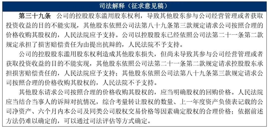 理由:一方面,该两款在《公司法》第89条第3款关于“严重损害公司或者其他股东利益的”的规定基础上,增加“控股股东滥用股东权利导致其他股东参与公司经营管理或者获取投资收益的目的不能实现”作为股权收购前提。我们认为该规定不尽合理,理由在于,新《公司法》的新增条款意在保护受压迫的中小股东,将严重利益损害结果作为滥用权利的认定标准,结合当前支持当事人适用该款的提出相关诉请的裁判数量有限的现实背景[1],从鼓励司法个案探索、放宽自由裁量权、形成整体经验的角度,不宜再增加如“股东的管理或收益目的不能实现”等限制条件。另一方面,为了给法院在探索过程中提供一定指引,我们建议在删除新增限制条件的同时,明确股东压迫的典型情形并设兜底条款。