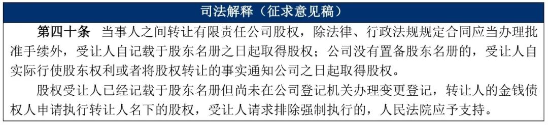 理由:本条与征求意见稿第三十三条关于名义股东处分股权的规定、第三十四条和第三十五条关于出资责任承担的规定、第四十一条关于一股二卖的处理息息相关,需在这些条文中建立体系协调并一以贯之的逻辑。首先,我们理解基于对实践中多数公司没有置备股东名册的妥协,征求意见稿以是否置备股东名册来设计不同的股权变动时点,但这一作法并不合理,既然在公司没有置备股东名册时,受让人可自实际行权或通知公司之日起取得股权,为何在公司设置股东名册时,反而不能通过实际行权等方式取得股权?如此实则变相鼓励公司取消股东名册的设置。其次,就股权变动标准选择而言,未必有绝对正确的答案,但只要规则是明确的,市场主体自会根据规则作出事先选择。目前征求意见稿中将没有置备股东名册的股权变动时点设定为两个,一是实际行使股东权利,二是通知公司。我们认为,应当删除第二项“通知公司”。股权变动不仅应当要通知公司,更应当取得公司同意,无论是要求记载于股东名册,还是进行工商登记,或者股东实际行使股东权利,这些要求背后体现的都是公司知晓并接受该股东。而如果仅仅只是通知公司便可发生股权变动,既与征求意见稿第三十一条关于实际出资人显名等规则存在体系违反,也并不利于解决纠纷。最后,其实更为激进,但十分有效的作法是,要求在未设置股东名册的情况下就应以工商登记为准。同时明确公司未依法置备股东名册的法律后果,包括不限于追究董事、高管违反勤勉义务的责任等,对公司施压倒逼公司治理逐步规范。