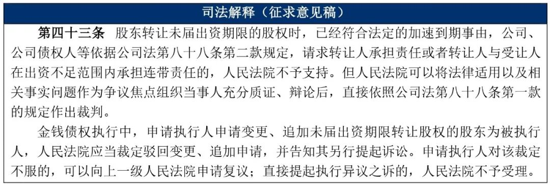 理由:首先,该条第一款关于“已经符合法定的加速到期事由”表述不明,由此存在两种理解:一种认为该句指向“客观上出现加速到期事由但未经有权机关宣告”的情形,也即出资义务应经宣告而不能自动届期,否则仍为未届期股权;另一种认为该句包含“已经法定程序宣告加速到期”的情形,也即判断原股东股转责任性质时,仅以章程约定出资期限为准,绝对排除加速到期制度适用。因而该条不仅偏离“解决出资义务是否必须经过宣告而不能自动加速到期”的立法初衷,更会带来没有必要的争议。为尽量减少歧义,我们建议按照前述第一种理解对条文予以细化。