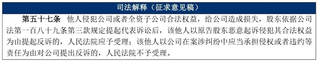 理由:该条内容此前规定在《九民纪要》第26条,根据《九民纪要》规定原文,不受理该反诉是因为“不符合反诉的要件”。从诉讼构造看,我们认可反诉只能对本诉原告提出,而股东代表诉讼的原告是股东而非公司,被告对公司提起的诉讼确实不符合反诉对象特定的要求,故无法适用案件受理费减半等反诉相关规则。但是,从纠纷解决的效率来看,股东代表诉讼的核心争点之一为公司与该他人之间的基础法律关系,若该双方均需对对方提出诉请,由同一审判组织一并审理则更利于高效查明事实、化解纠纷。根据《民事诉讼法解释》第二百二十一条,“基于同一事实发生的纠纷,当事人分别向同一人民法院起诉的,人民法院可以合并审理”,建议本解释在明确不受理反诉的同时,明确法院可以合并审理。