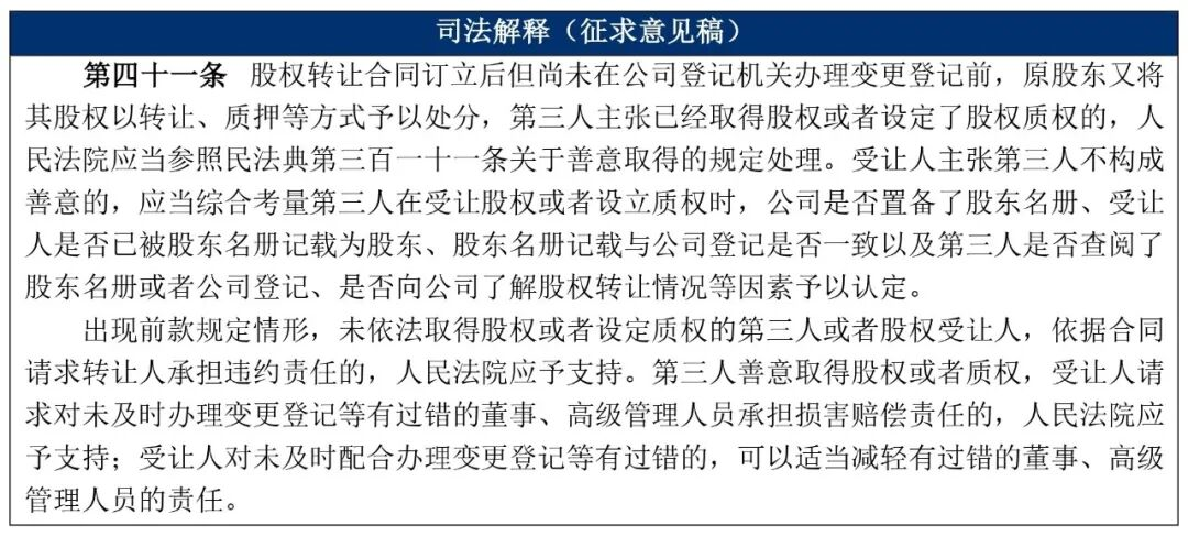 【建议】将第一款前半段“股权转让合同订立后但尚未在公司登记机关办理变更登记前”改为“受让人被记载于股东名册/受让人实际行权后,但尚未办理变更登记前”;后半段“受让人主张第三人不构成善意的,应当综合考量第三人在受让股权或者设立质权时,公司是否置备了股东名册、受让人是否已被股东名册记载为股东、股东名册记载与公司登记是否一致以及第三人是否查阅了股东名册或者公司登记、是否向公司了解股权转让情况等因素予以认定”改为“受让人主张第三人不构成善意的,应考察第三人受让股权或取得质权时是否明知受让人已被记载于股东名册/受让人已实际行权、转让人已通知公司及其他股东且后者在合理时间内未提出异议”。