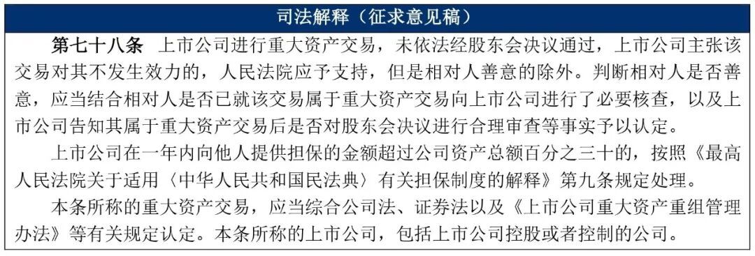 理由:《民法典担保制度解释》第九条并未区分上市公司在一年内向他人提供担保的金额是否超过公司资产总额百分之三十,只要上市公司提供担保,均需按照该规定进行决议、公告,征求意见稿中要求上市公司在一年内向他人提供担保的金额超过公司资产总额百分之三十按照《民法典担保制度解释》第九条来处理,容易引发歧义,即百分之三十以内的担保不需要履行《民法典担保制度解释》第九条规定的程序。
