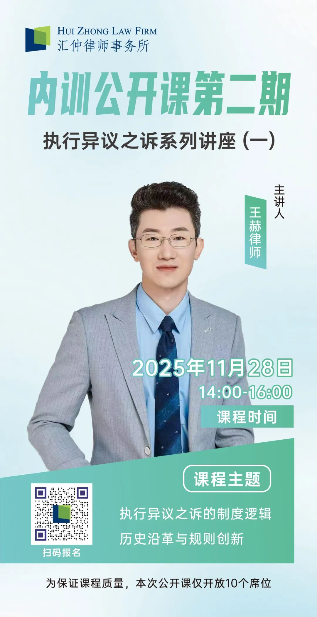 系列讲座的第一期由王赫律师进行分享,主题为《执行异议之诉的制度逻辑、历史沿革与规则创新》。本次讲座的举办时间为2025年11月28日(周五)下午14:00-16:00,地点在北京嘉里中心北楼21层,欢迎有兴趣的朋友扫描下方二维码报名参加。报名成功后您将收到邮件通知。