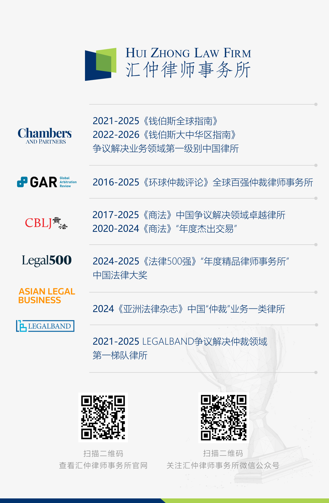 罗律师近年多次成为The Legal 500、Benchmark Litigation及《商法》杂志评选的诉讼仲裁领域上榜律师,荣获《亚洲法律杂志》 “十五佳诉讼律师”及荣登The Legal 500首届中国仲裁权威榜。