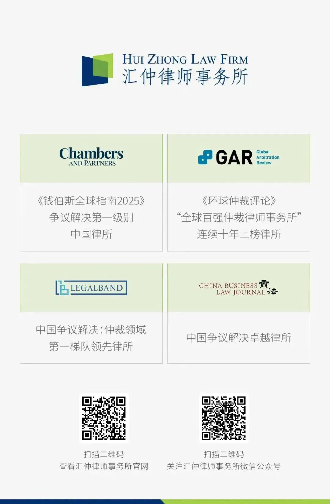 汇仲律师事务所是一家专注于国内与国际高端民商事争议解决的精品律所,在北京、上海、深圳、香港、新加坡设有办公室。汇仲律师十分擅长处理重大复杂疑难案件与新型跨境案件,志不求易,事不避难,能够不遗余力地搜寻可以改变判决结果的微小事实,在诉讼仲裁等争议解决领域具有丰富经验和斐然成绩。汇仲已经快速发展成为中国争议解决律师方阵中的一支劲旅。